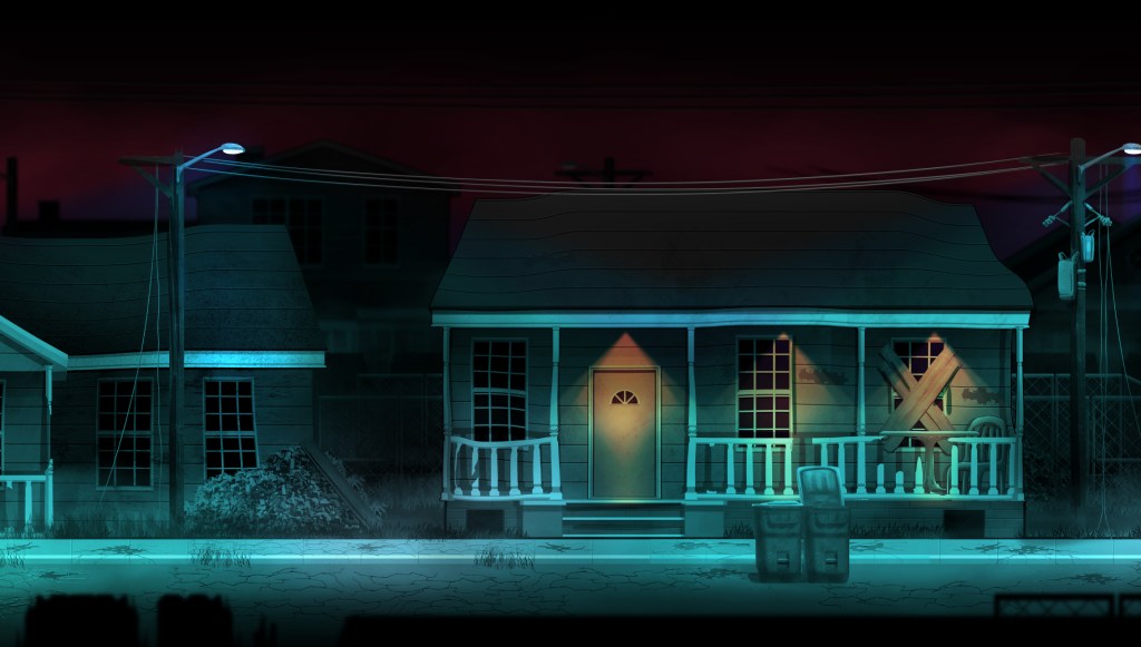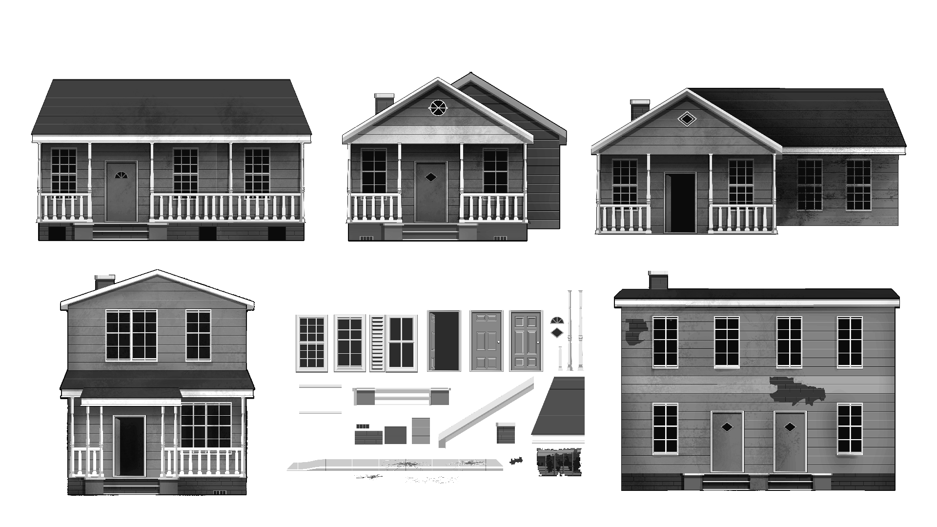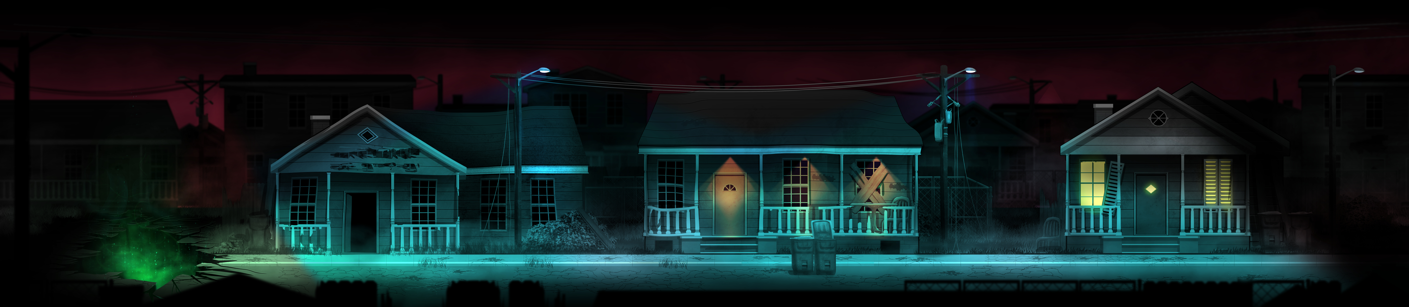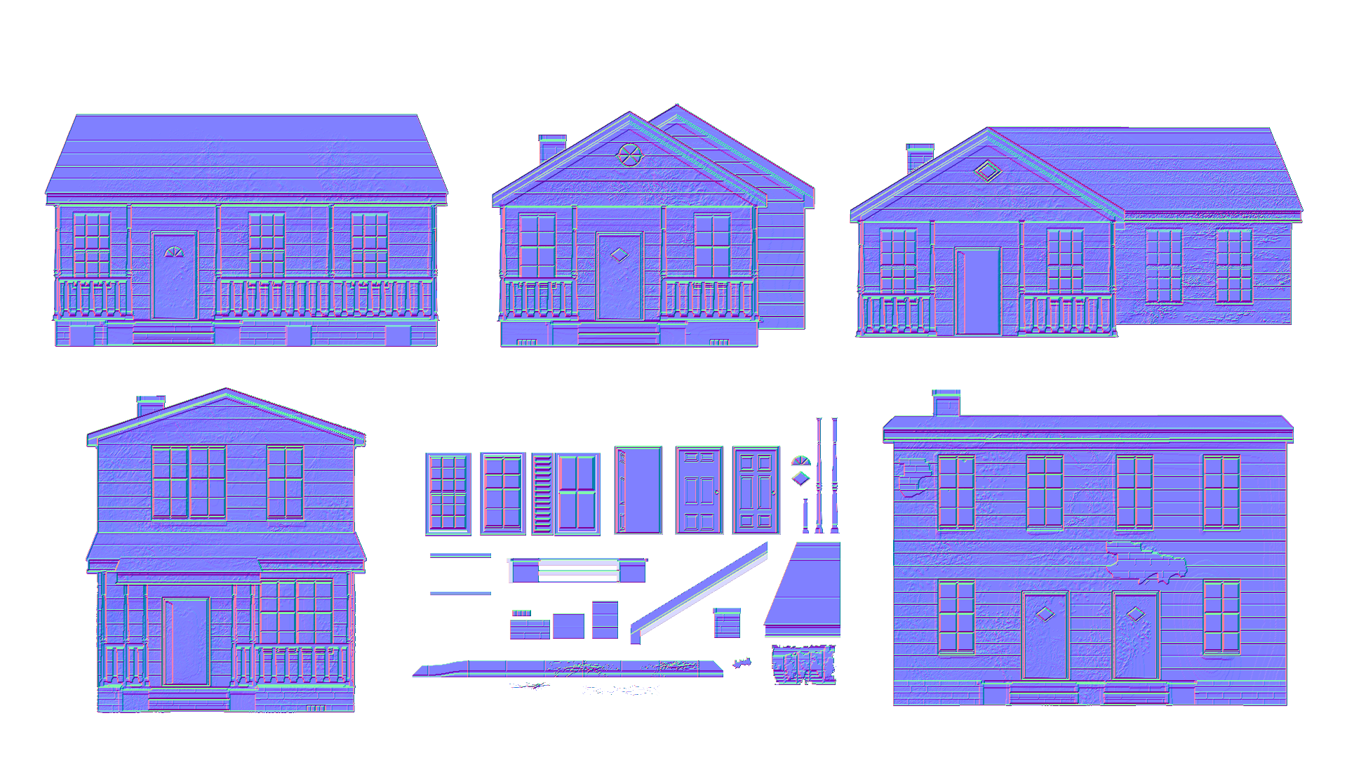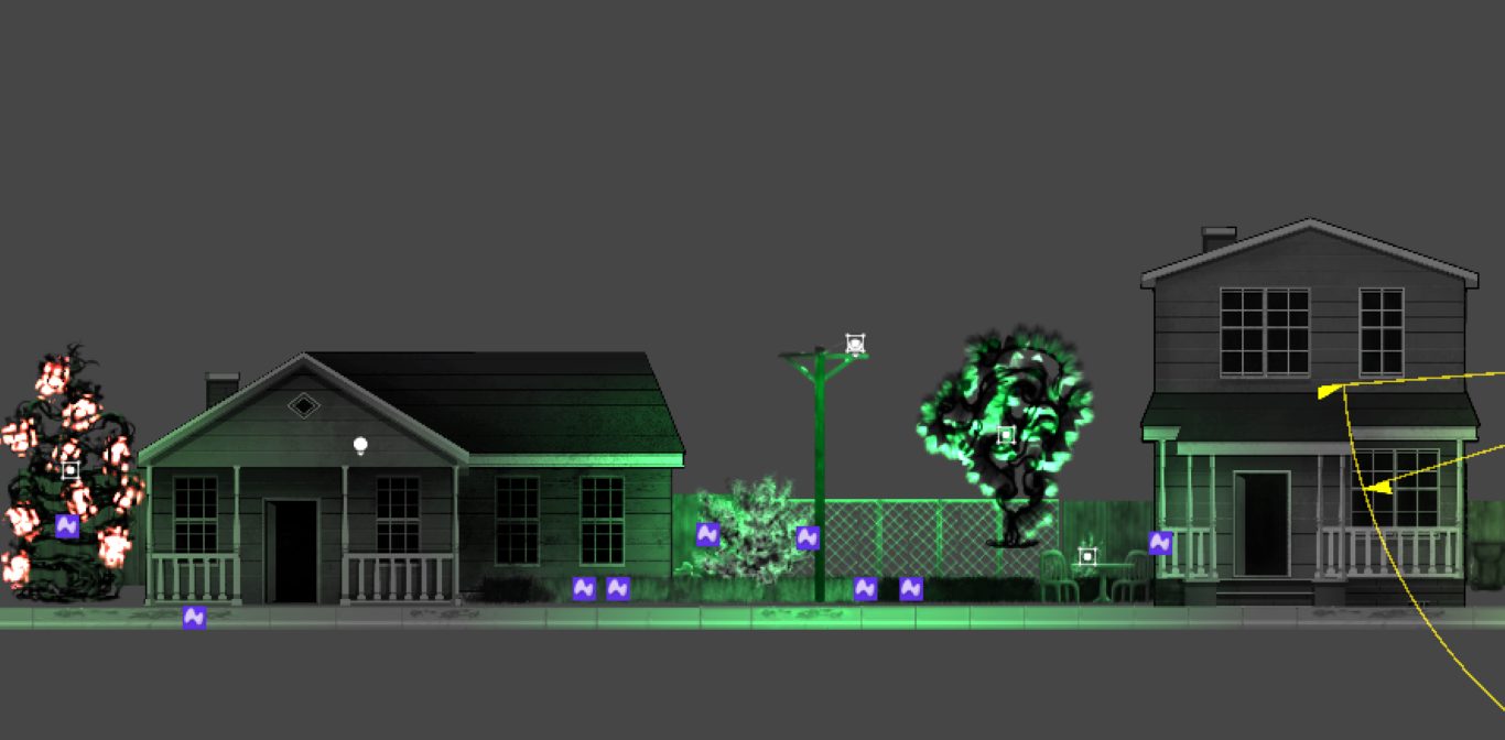 Since I wanted to get an immersive half-realistic, half-stylized look, I’ve decided to incorporate a parallax effect as well as to use normal maps to further enhance the feeling of depth. I began by drawing houses and various other street props/assets in Clip Studio Paint. I knew I wanted to light the scene in Unity to get the dramatic effect I was after, so I’ve created Normal Maps for each of the props using a filter in GIMP.